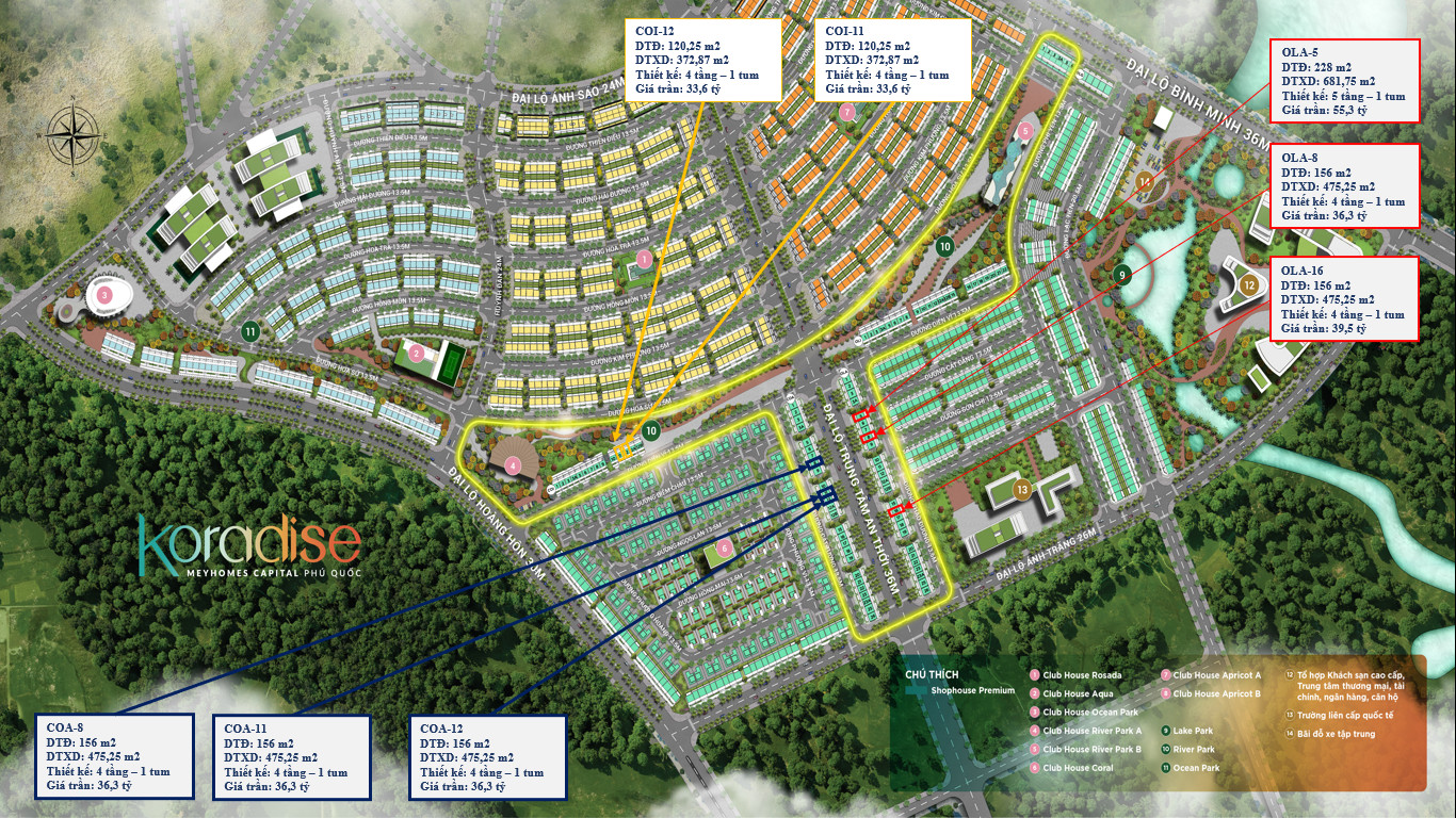 Được tư vấn quy hoạch và định hướng phát triển bởi Daewoo E&C, tiểu khu The Koradise gồm 94 nhà phố shophouse mang phong cách Hàn Quốc. Đây là những shophouse cao cấp bậc nhất tại đại đô thị Meyhomes Capital Phú Quốc. The Koradise cũng sở hữu vị trí đắc địa bậc nhất khi tọa lạc tại trục công viên sông (trục cảnh quan quan trọng nhất dự án) và trục đại lộ trung tâm An Thới rộng 36m.